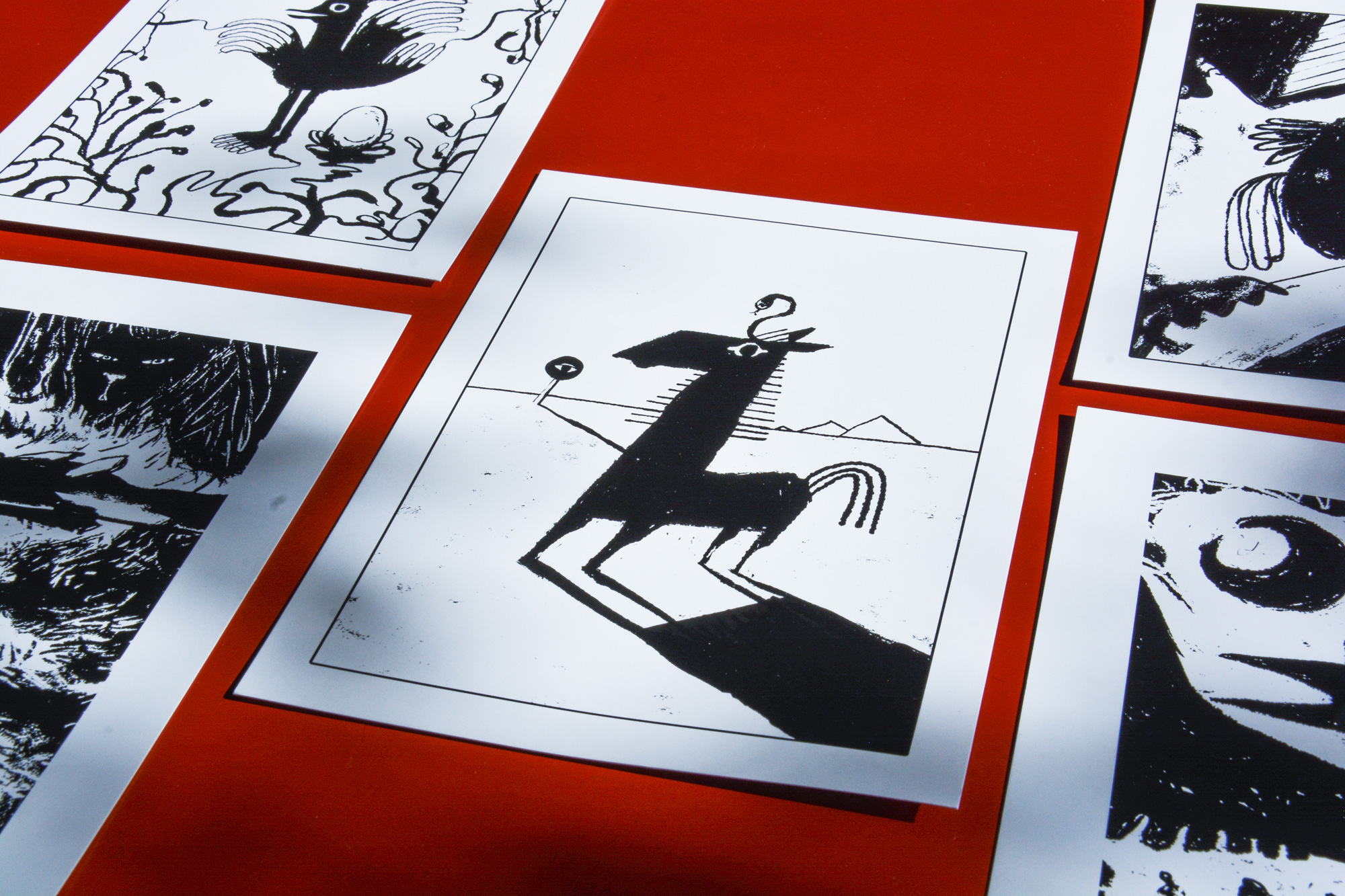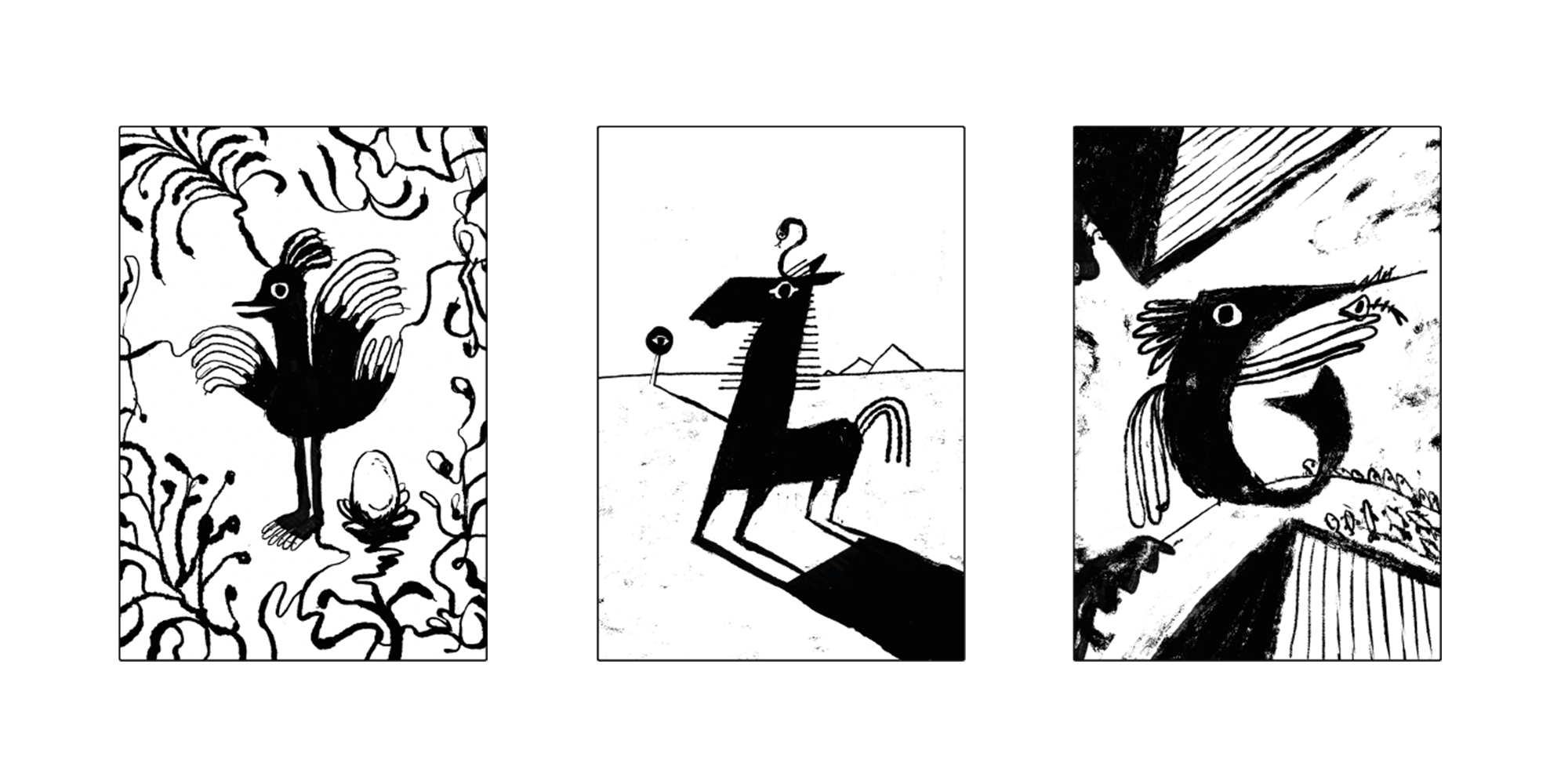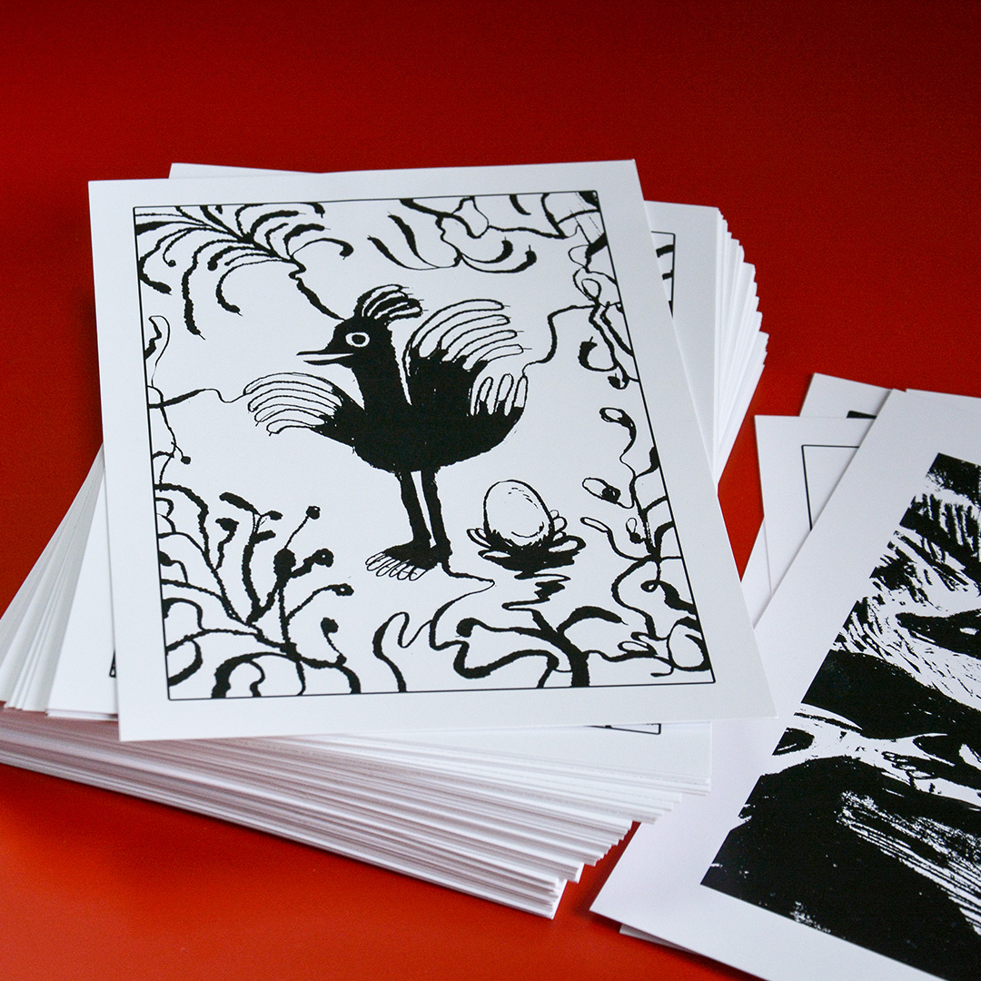 Ink drawings of gloomy creatures lurking in weird, surreal and dark places. You can find postcards of these cuties on Etsy.