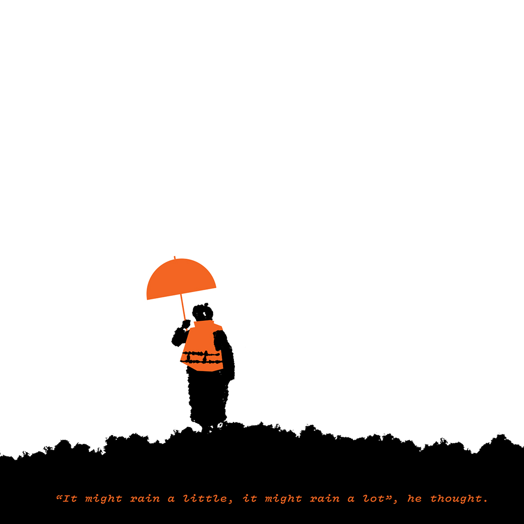of a man trying to figure out what to wear under the orange sun.